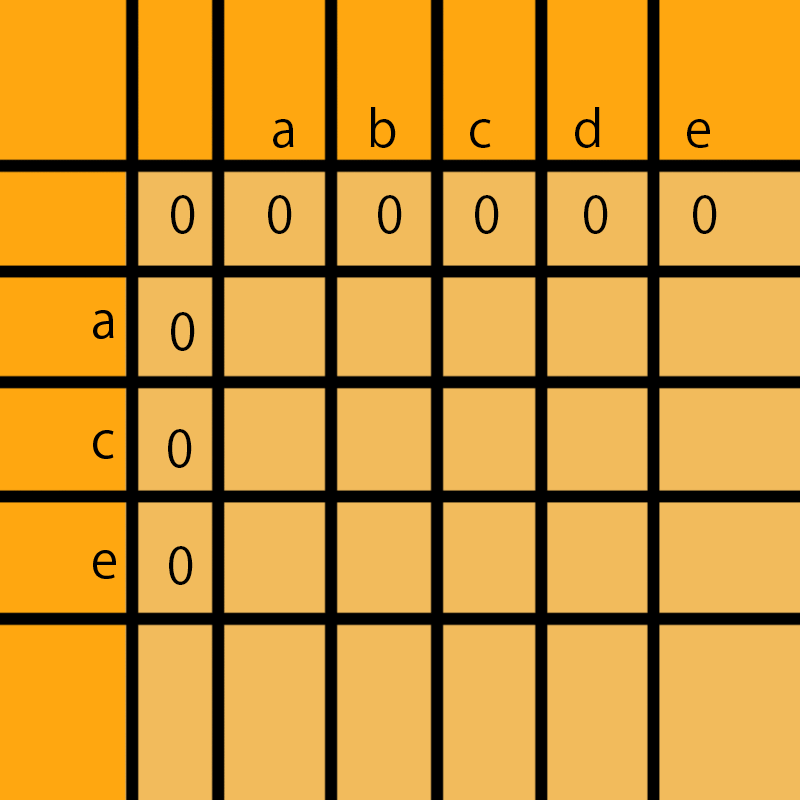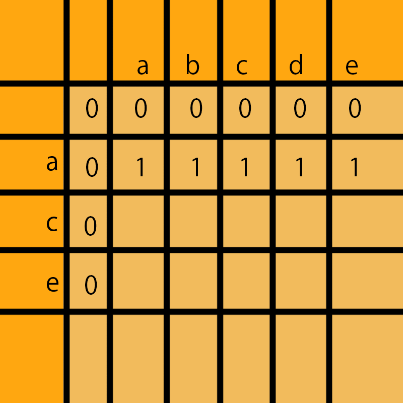 动态规划我们拿笔画一画,一个作为横轴一个作为纵轴,我们以2个字符串为例子,那么abcde作为横轴,ace作为纵轴,先初始化第一行和第一列;因为空字符串无论和 abcde 和 ace比,没有公共的子序列,所以都是0,在一个二维数组里存放的格式dp[[0,0,0,0,0],[0],[0]]