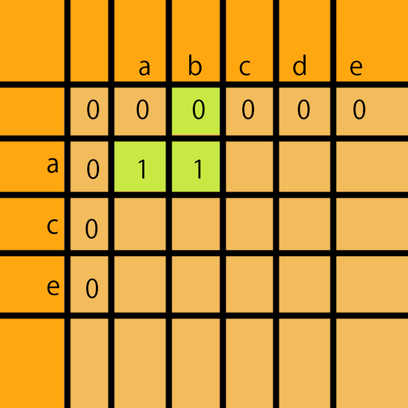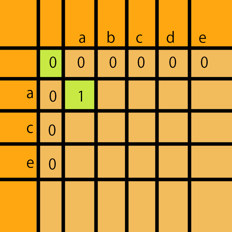 a和a比有公共子序列a,那么这里就拿他们前面最优子解加上1,这个0加1等于1,所以这里填1。