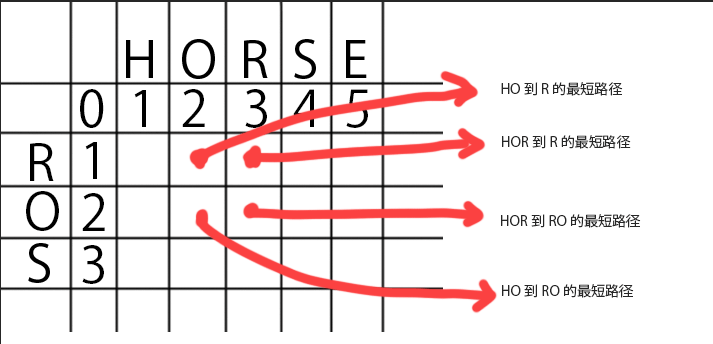 计算两个单词horse和ros之间的编辑距离D,容易发现把单词变短会让问题变的简单,很自然利用D[n][m],表示单词长度n和m的编辑距离